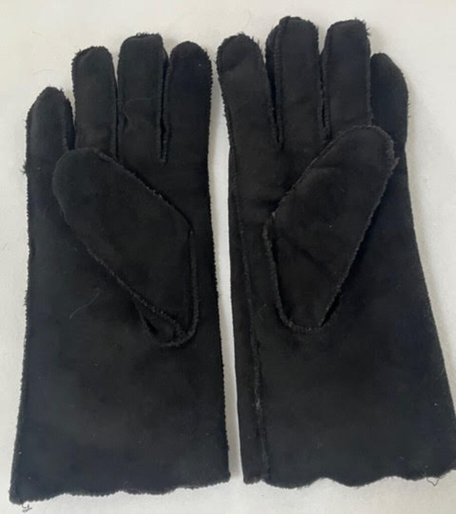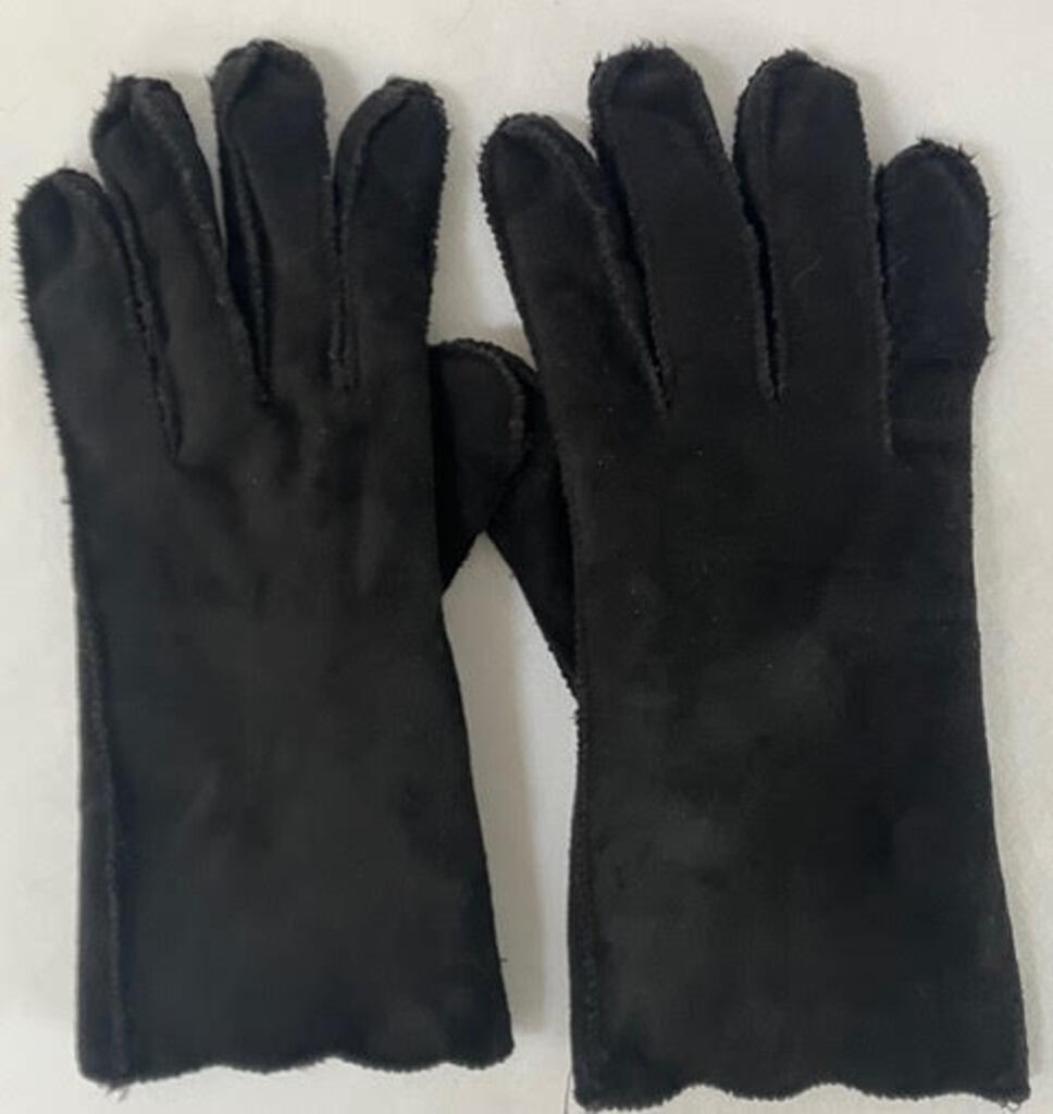 Women’s Velveteen Style Black Gloves. Size 7. Great looking and warm with scalloped rims. Measures 10” Long.