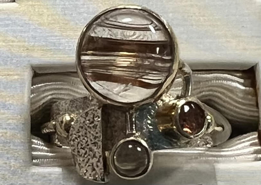 Sterling Silver with Vermeil Accents Rutilated Quartz, Smoky Quartz and Sunstone Ring with Textured Finish Size 7 SKU# 650-469