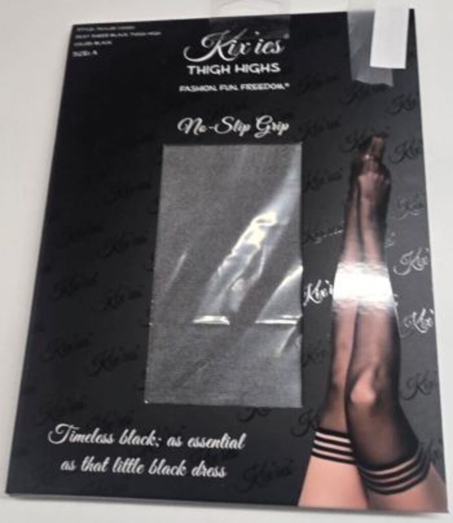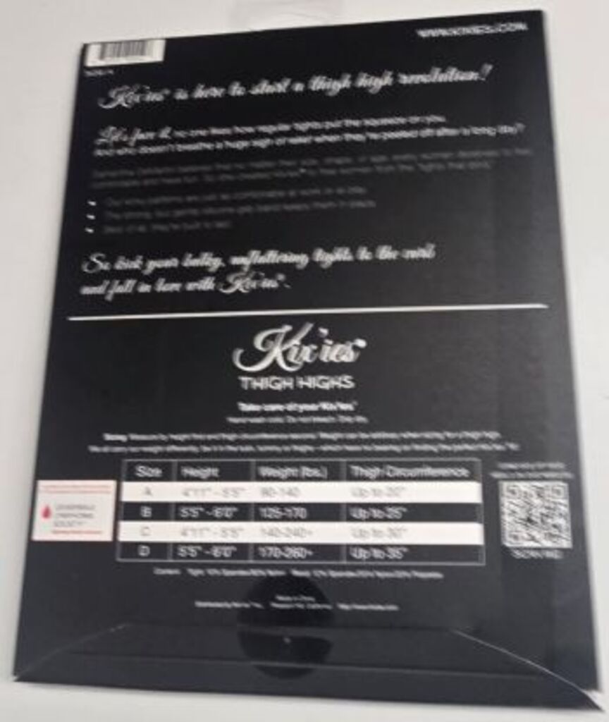 90% Nylon, 10% Spandex. This stocking has an attractive design, a no slip grip and a soft feel. Comfortable, durable, popular, sexy and unique. Ideal for everyday use or for that special occasion. Made in China. Original Kixies stocking. FITTING GUIDE: Fits according to size chart pictured.