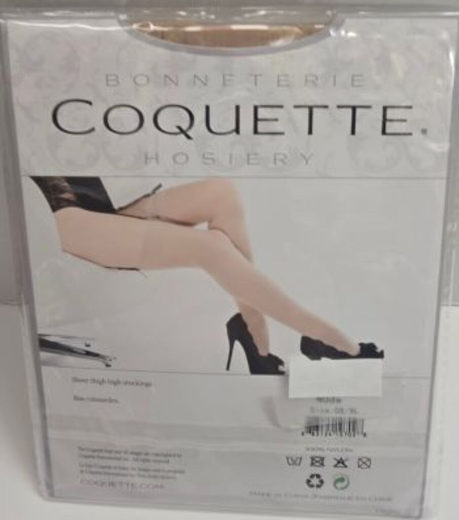 100% Nylon. These sheer thigh stockings are comfortable, during, fashionable, sexy and unique. Ideal for everyday wear or for that special occasion. Made in China. Original Coquette stocking. FITTING GUIDE: One size.