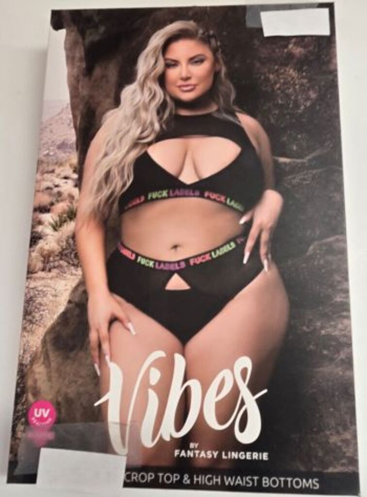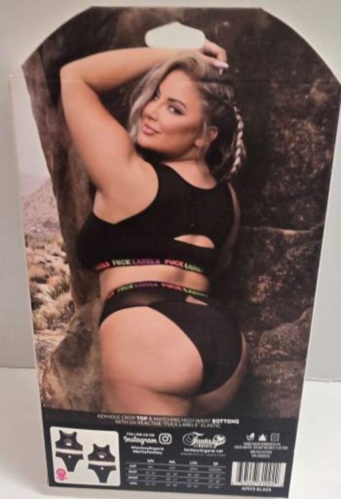 90% Polyester, 10% spandex. This two piece set has a keyhole crop top, matching high waist bottoms and UV reactive " F____ labels " elastic, Comfortable, durable, sexy and unique. Ideal for exercise or for that special occasion. Made in China. Origional Fantasy garment. FITTING GUIDE: Fits 1X -- 2X.