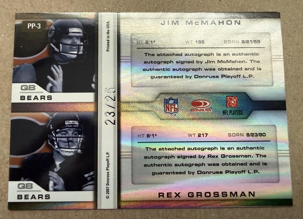 This is a 2007 leaf Limited, Jim McMahon and Rex Grossman autographed card and his number 23 out of 25. The area of the autographs is glossy so it’s hard to get a good picture. This would be a great gift for a Chicago Bears band.