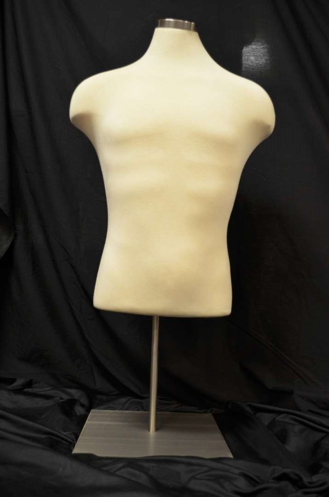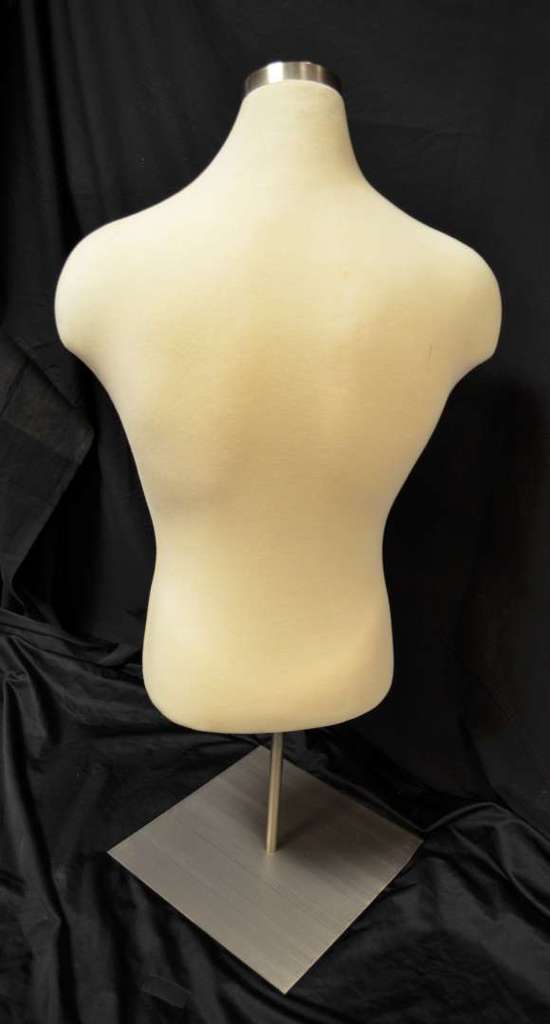 Male counter top cloth torso mannequin with adjustable base included.