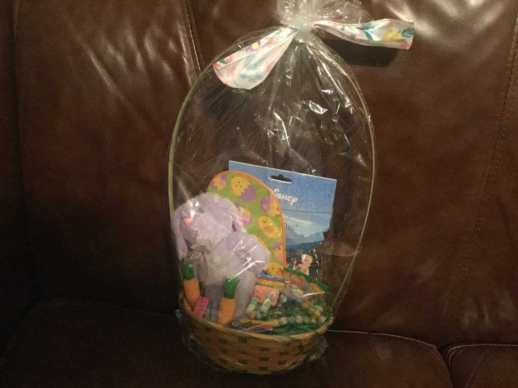 The basket contains a purple bunny. Frozen stickers, a paddle ball. It contains assorted Easter candy.