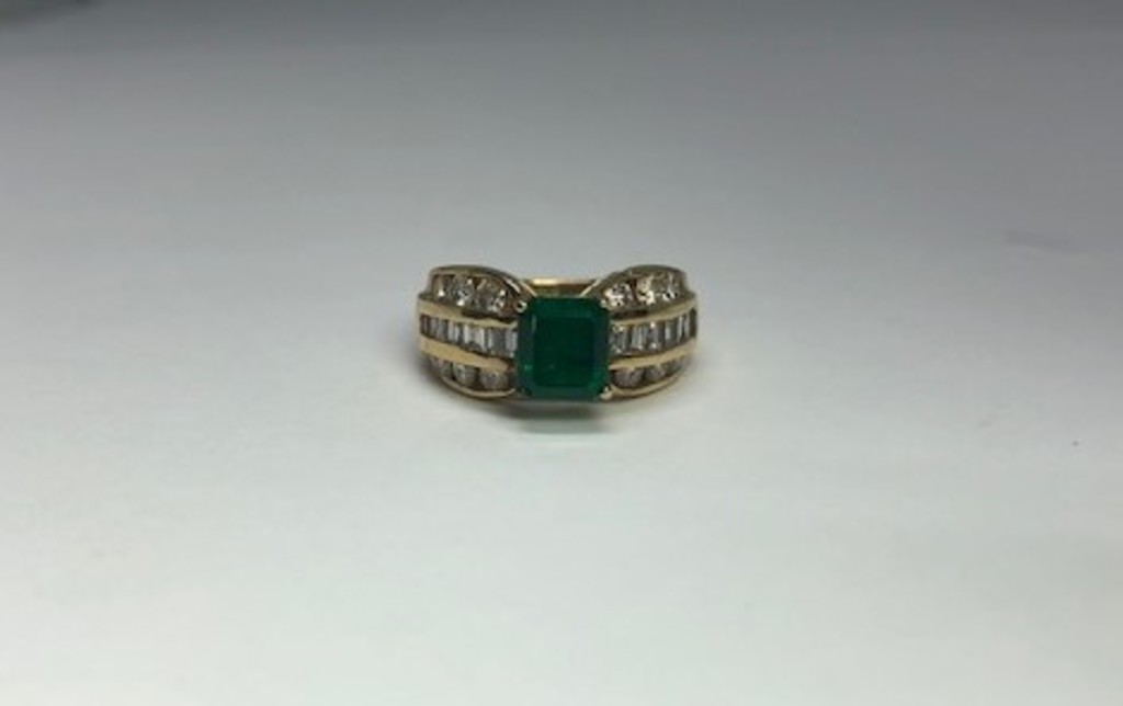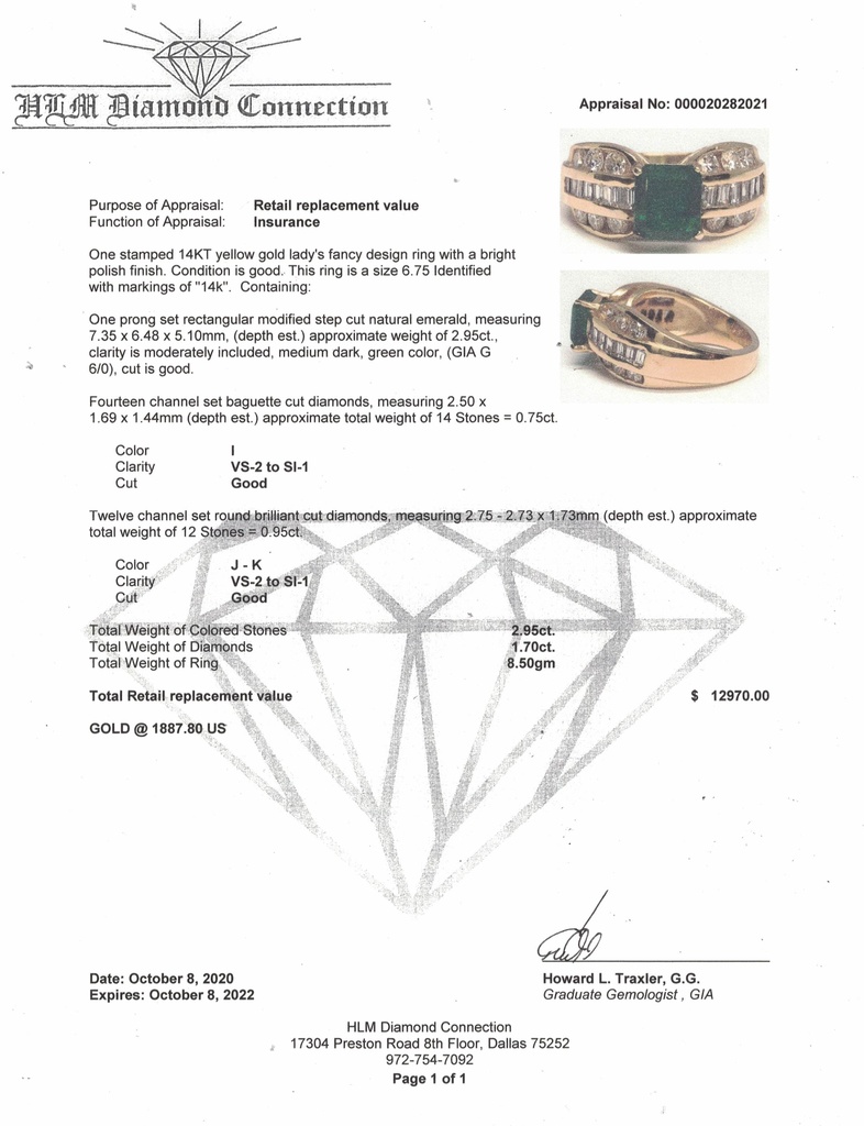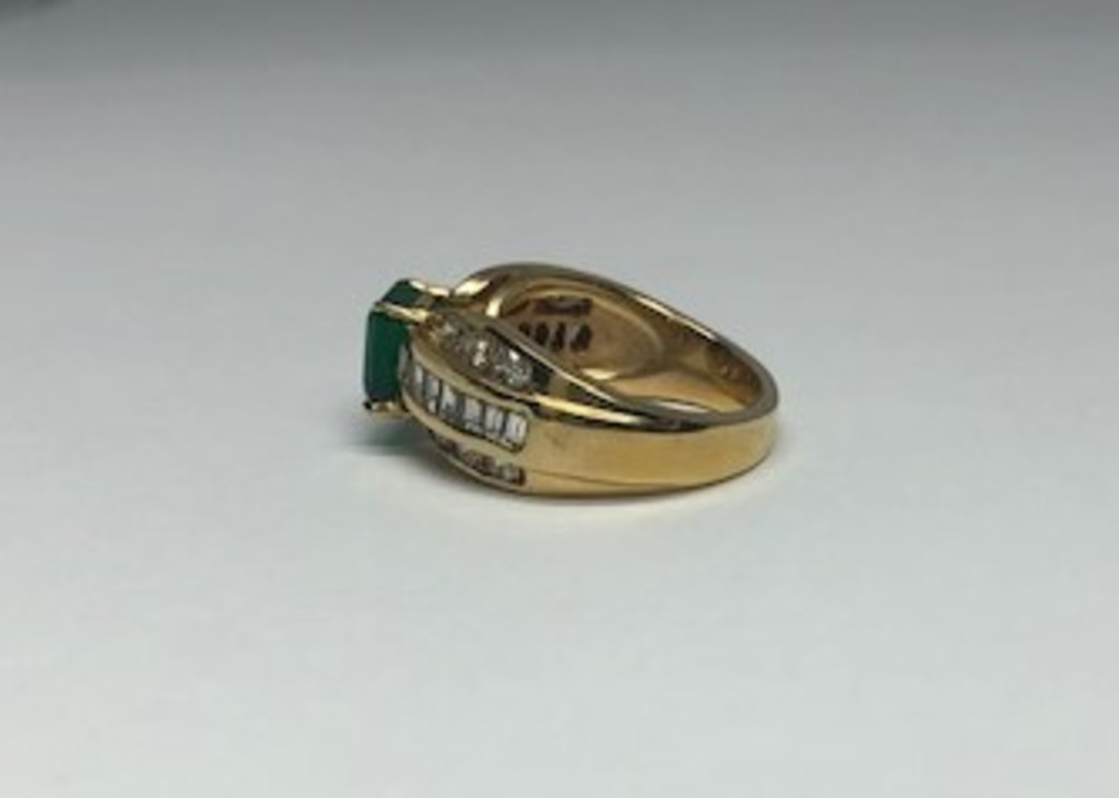 14 Karat yellow gold lady's fancy design ring with a bright polish finish. Size 6 3/4. 2.95 Carat Emerald and 1.70 Carats of Diamonds. Certified GIA appraisal included.